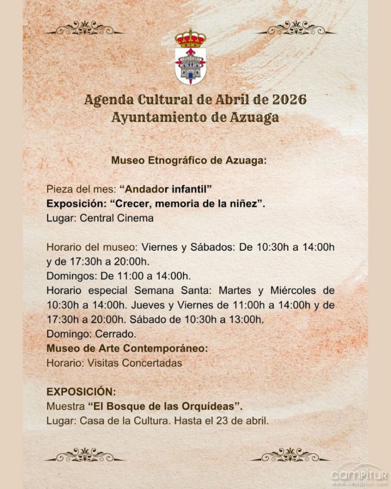 Azuaga afronta el mes de abril de 2026 con una programación amplia y variada en la que tendrán cabida la naturaleza, la música, el deporte, la formación, la actividad cultural y varias citas de carácter social y divulgativo. La Agenda Cultural de Abril de 2026 del Ayuntamiento reúne propuestas repartidas a lo largo de todo el mes y pensadas para públicos diferentes, desde exposiciones permanentes y talleres gratuitos hasta jornadas temáticas, audiciones, documentales, danza o encuentros asociativos.