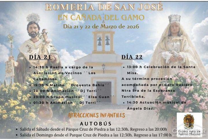 Cañada del Gamo vivirá este fin de semana una de sus celebraciones más esperadas con la llegada de la tradicional Romería de San José, una cita que reunirá a vecinos y visitantes durante los días sábado 21 y domingo 22 de marzo de 2026 en torno a la convivencia, la música y los actos religiosos.