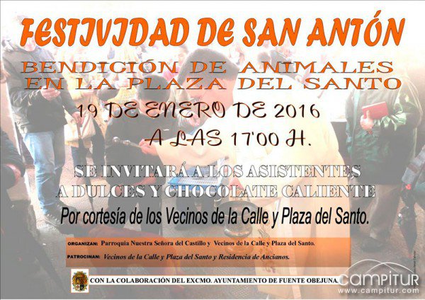 El martes, 19 de enero, Fuente Obejuna festeja su tradicional festividad de San Antón, con numerosos actos organizados por la Parroquia Nuestra Señora del Castillo y Vecinos de la Calle y Plaza del Santo.