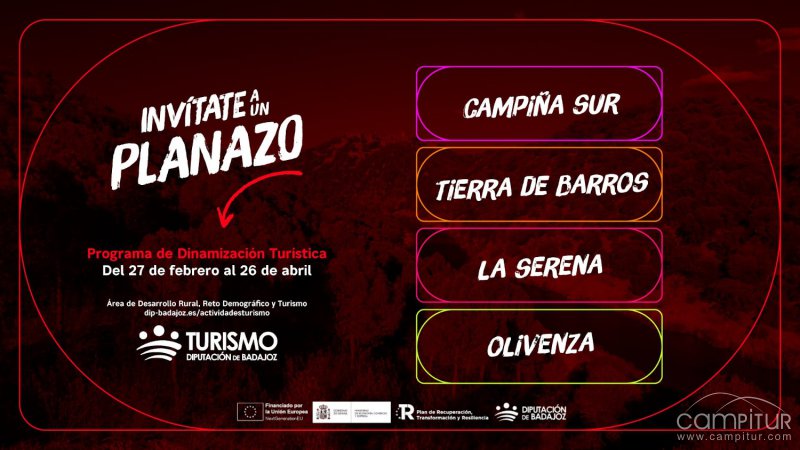 La Diputación de Badajoz, a través de la Oficina de Promoción Turística, pone en marcha un nuevo calendario con 55 actividades repartidas en cuatro comarcas de la provincia y pensadas para descubrir y revalorizar su riqueza cultural, natural y gastronómica. La iniciativa forma parte del programa de dinamización comarcal “Invítate a un planazo” y se desarrollará los fines de semana de febrero, marzo y abril, con propuestas que arrancan el sábado 27 de febrero y se extenderán hasta el 26 de abril.
