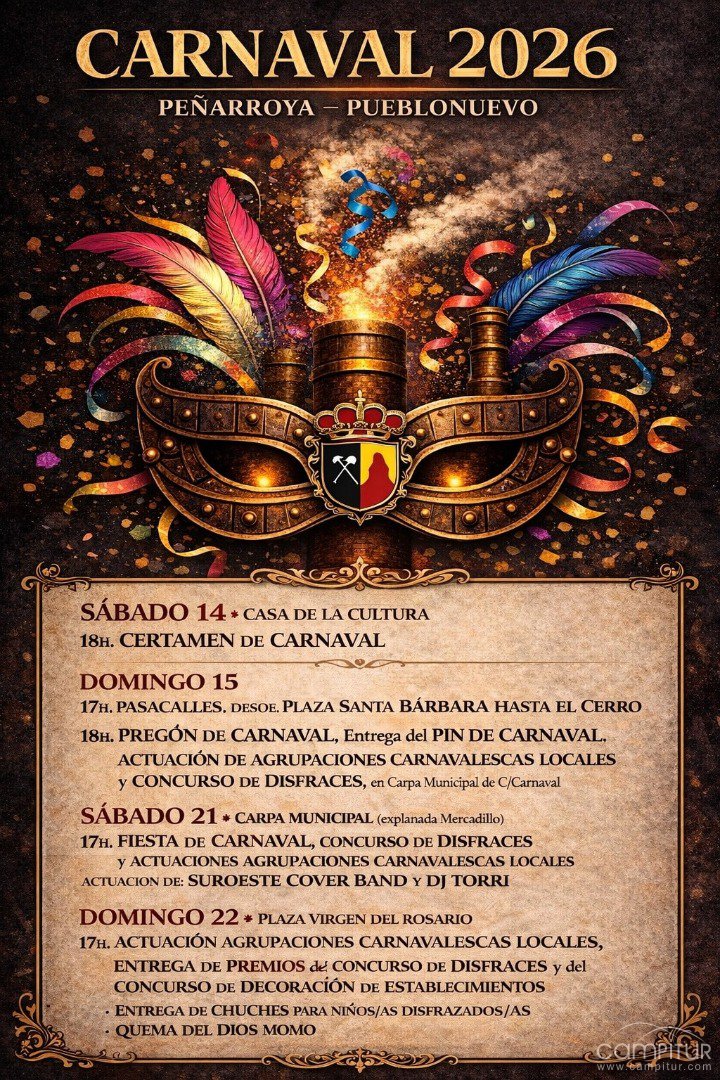 Peñarroya-Pueblonuevo ya tiene listo el calendario de su Carnaval 2026, una celebración que repartirá su programación en varias jornadas para llenar de ambiente festivo distintos espacios del municipio. El cartel anunciador avanza un programa en el que no faltan el certamen de carnaval, el pasacalles, el pregón, las actuaciones de agrupaciones locales, los concursos de disfraces y, como colofón, la quema del Dios Momo.