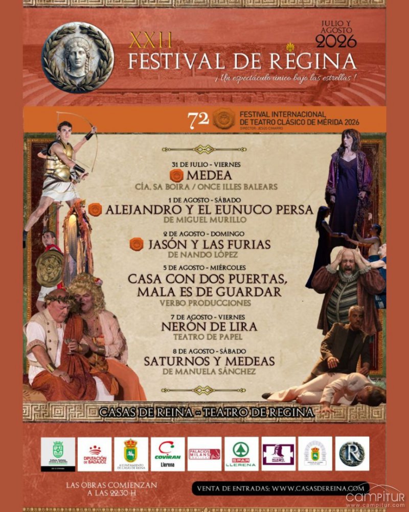 Tras este primer bloque, el escenario de Regina dará paso al XXII Festival de Regina 2026, integrado en el 72 Festival Internacional de Teatro Clásico de Mérida, una cita que volverá a traer a Casas de Reina propuestas destacadas del panorama escénico. La programación comenzará el viernes 31 de julio con Medea, de Cía. Sa Boira / Once Illes Balears.